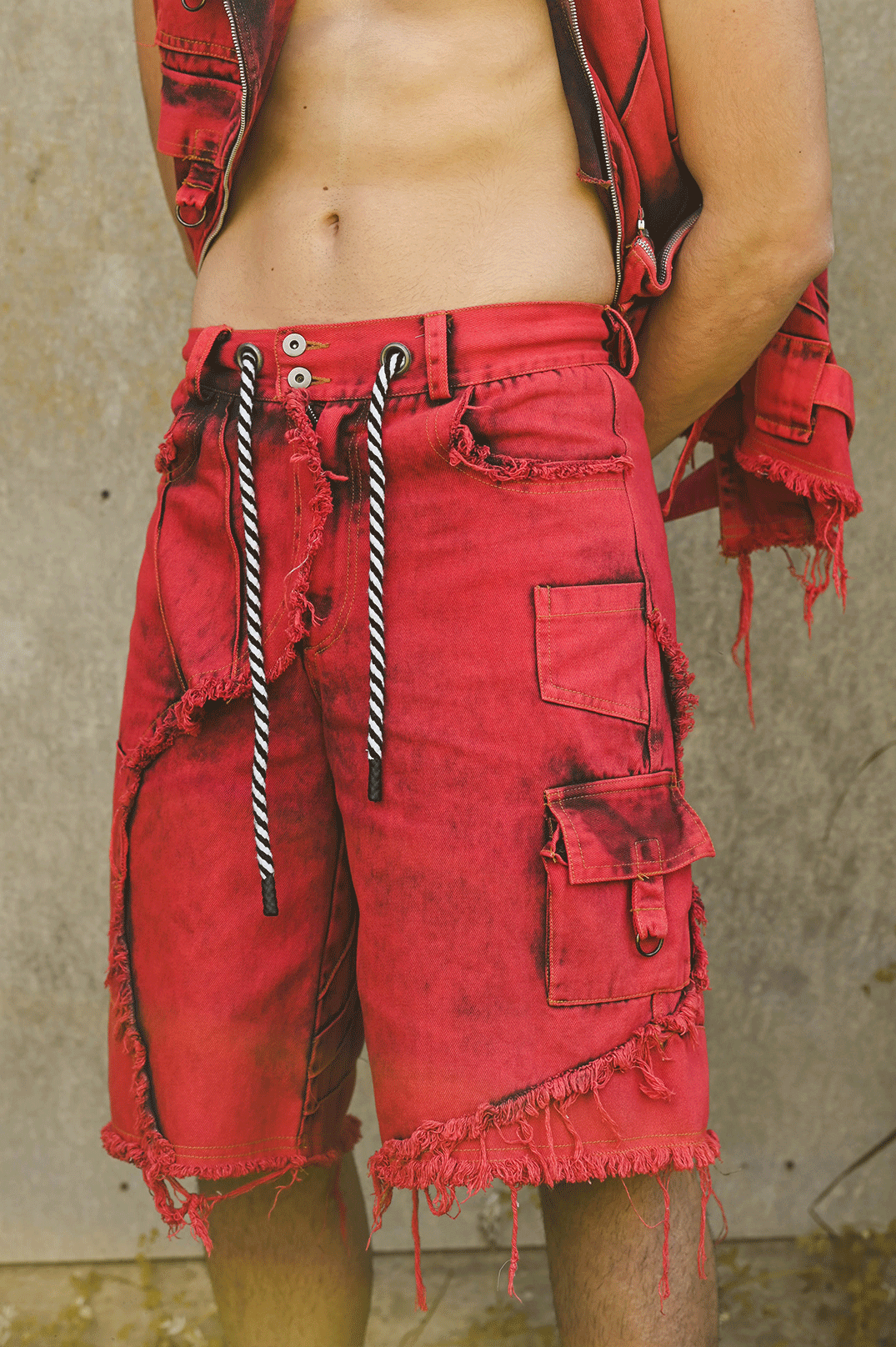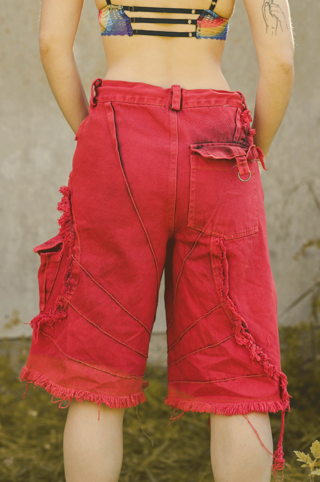 מכנסי ברמודה עם כיסים מבד ג׳ינס אדום שטוף עם קצוות פרומים
