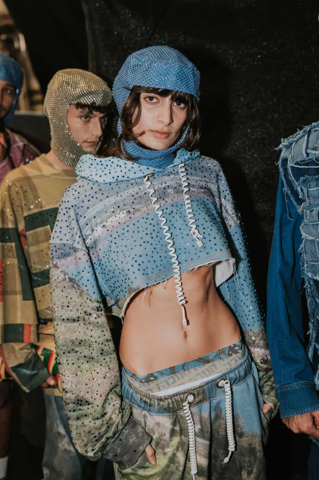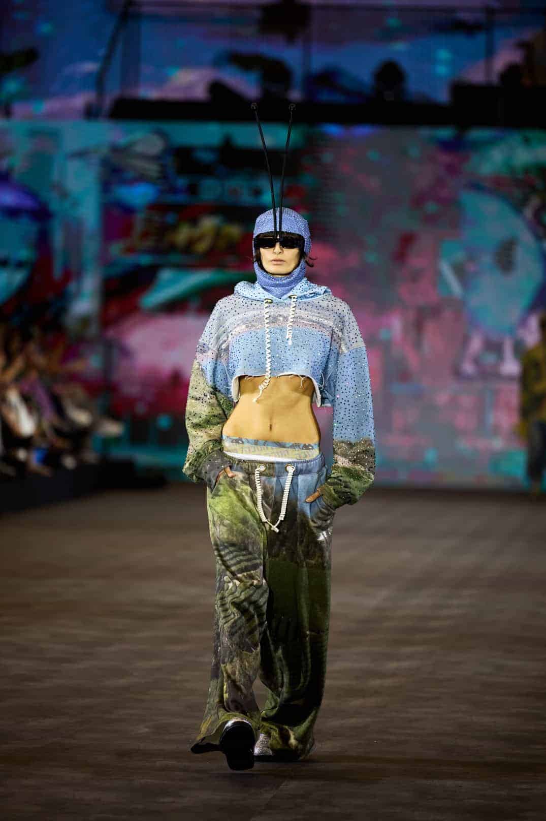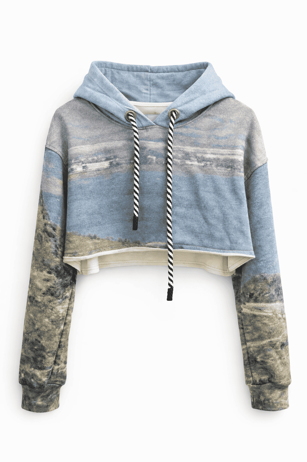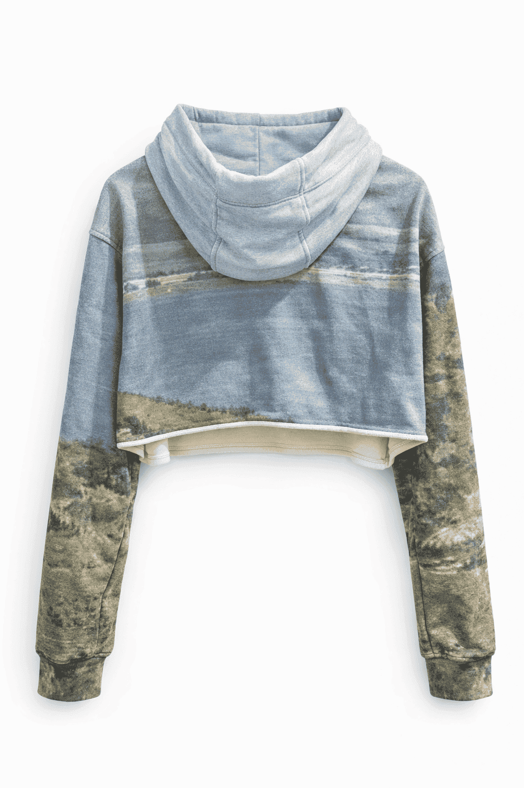Cropped heavy French terry hoodie featuring an all-over digital landscape print inspired by the Sea of Galilee.